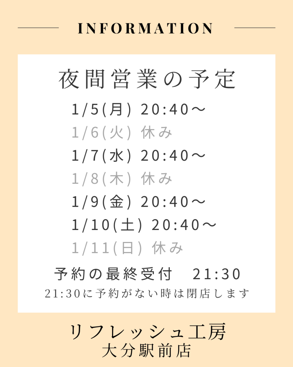 2026-01-04 Home › 夜間営業 › 夜間営業の予定(1/5〜1/11) 夜間営業の予定(1/5〜1/11) 夜間営業日は20:00迄に一度閉店し、20:40までに再開店します。 予約は電話でもネット予約でも大丈夫です。予約枠は少ないため、お早めにご予約ください。 関連記事 夜間営業の予定(12/22〜12/28) 夜間営業の予定(12/22〜12/28) コメントを残す コメントをキャンセルメールアドレスが公開されることはありません。 ※ が付いている欄は必須項目ですコメント ※ 名前 ※ メール ※ サイト 次回のコメントで使用するためブラウザーに自分の名前、メールアドレス、サイトを保存する。
