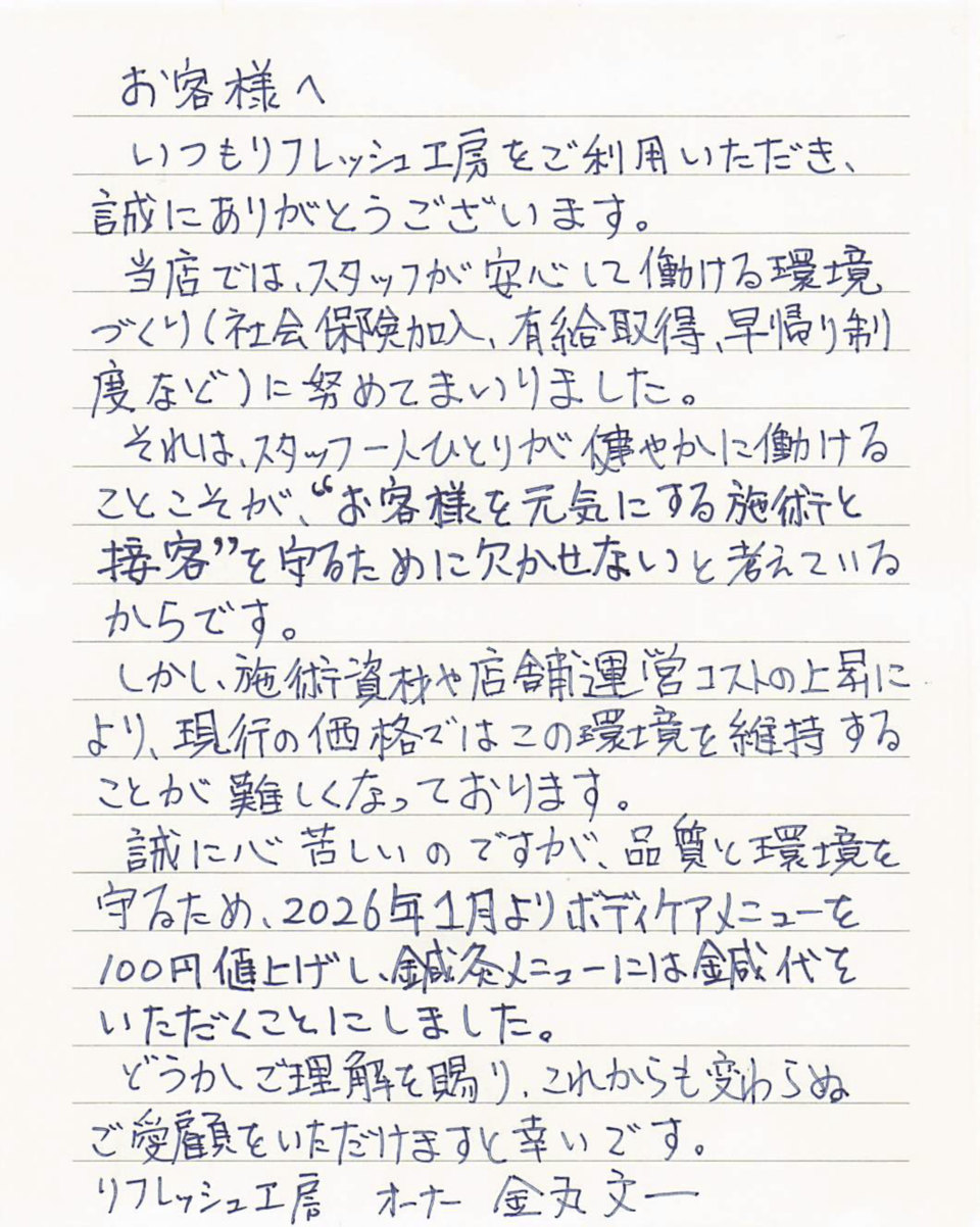誠に心苦しいのですが、品質と環境を守るため、2026年1月よりボディケアメニューを100円値上げし、鍼灸メニューには鍼代をいただくことにしました。