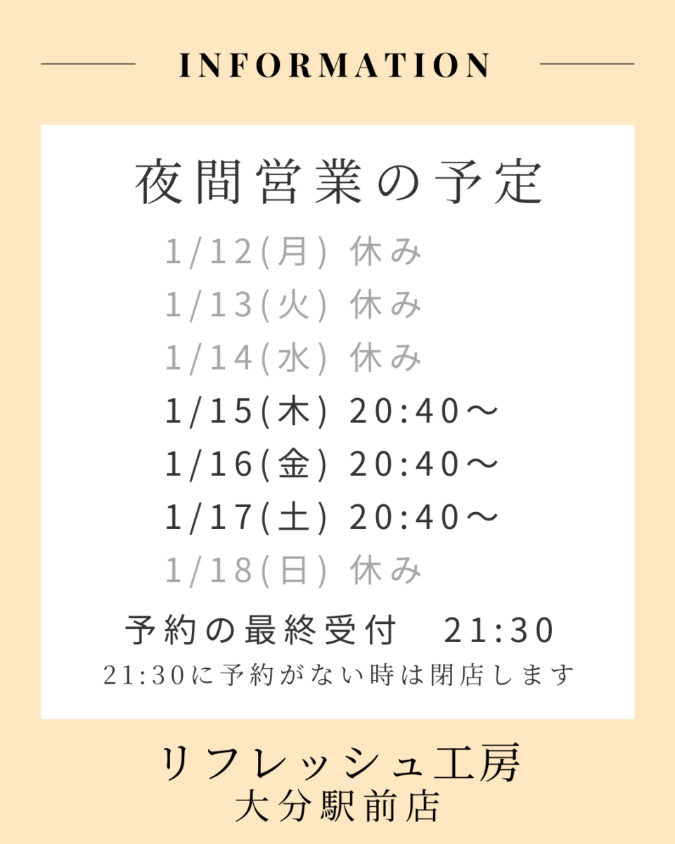 2026-01-11 Home › サロンNEWS › 夜間営業の予定(1/12〜1/18) 夜間営業の予定(1/12〜1/18) 夜間営業日は20:00迄に一度閉店し、20:40までに再開店します。 予約は電話でもネット予約でも大丈夫です。予約枠は少ないため、お早めにご予約ください。 関連記事 今日は新月。心と体の“リセット日”です 本日新月。心と身体のリフレッシュ時間をどうぞ! Instagram再開しました 感謝!皆様のクチコミが生んだ支援 【新人スタッフ応援割】対象メニュー拡大のお知らせ お正月の食べ飲み疲れ、そろそろ出ていませんか? コメントを残す コメントをキャンセルメールアドレスが公開されることはありません。 ※ が付いている欄は必須項目ですコメント ※ 名前 ※ メール ※ サイト 次回のコメントで使用するためブラウザーに自分の名前、メールアドレス、サイトを保存する。